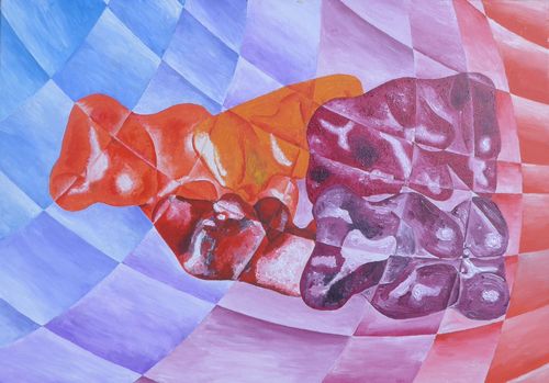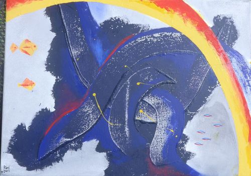 Daraus entsteht neben der physikalischen Erscheinung Regenbogen auch die linksdrehende Helix des DNS-Stranges, der hier in Form von Zellstrukturen dargestellt ist. Die Zellstrukturen sind unten noch recht einfach , die Abgrenzungen der einzelnen Zellen erweitern sich nach oben in Nervenbahnen und Synapsen.