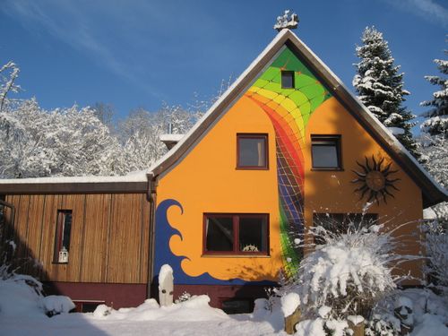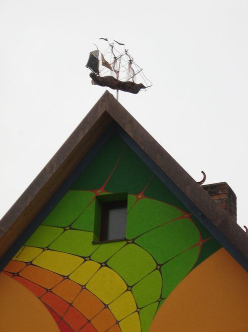 „Farbe ist Nahrung für die Seele“, dieser Satz von Friedensreich Hundertwasser hat mich seit vielen Jahren fasziniert und so war es kein Wunder, dass bei der Suche nach einer neuen Farbe für mein Wohnhaus und Atelier keine der sonst in den Siedlungen und Dörfern üblichen grau-beige-weißen Anstriche in Frage kam.