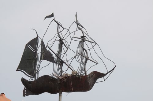 Jeder, der als Hochseesegler die Macht des Windes und der Wellen am eigenen Leib erfahren hat, kann nachempfinden, warum diese Wetterfahne in Form einer Dreimastbark so beeindruckend zerzaust erscheint. Ein wahrhaftiger Sturm kann mitunter beängstigend wirken und das Vertrauen in die Strukturen des Schiffes erheblich erschüttern. Aus diesen intensiven Erfahrungen heraus wurde dieses Schiff gestaltet, und es vermittelt eindrucksvoll die ungezügelte Kraft, mit der Wind und Wellen an der Struktur des Schiffes zehren.
